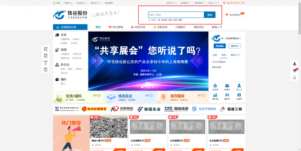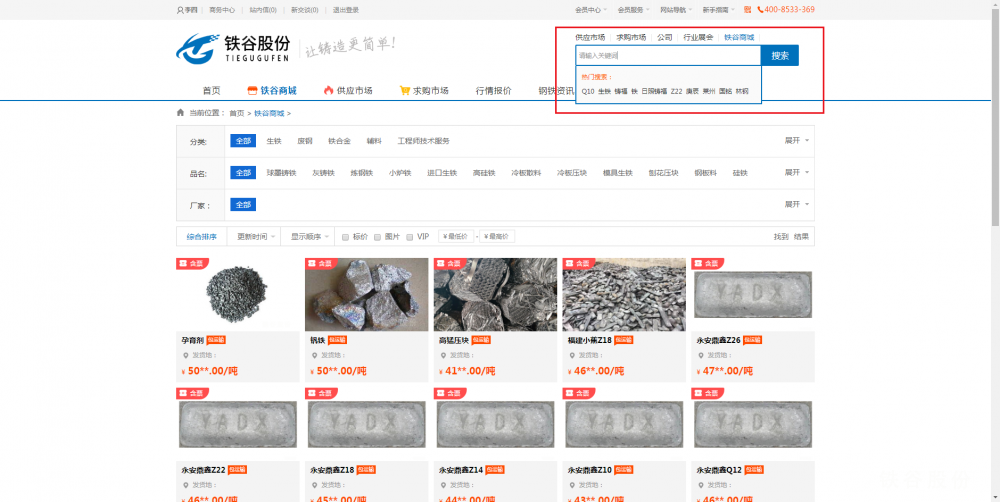 方法二:登錄狀態下,進入【鐵谷商城】,在頁面右上方搜索框里輸入相應的商品名稱或型號等關鍵詞進行搜索即可。