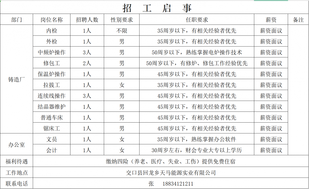 交口縣回龍鄉天馬能源實業有限公司招工啟事