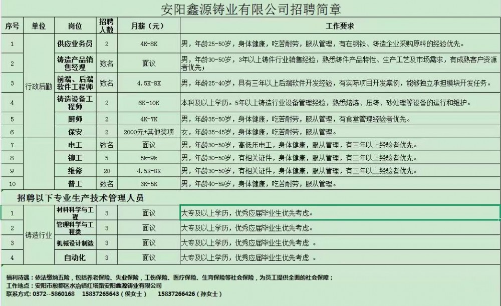 安陽鑫源鑄業有限公司招聘專業生產技術管理人員