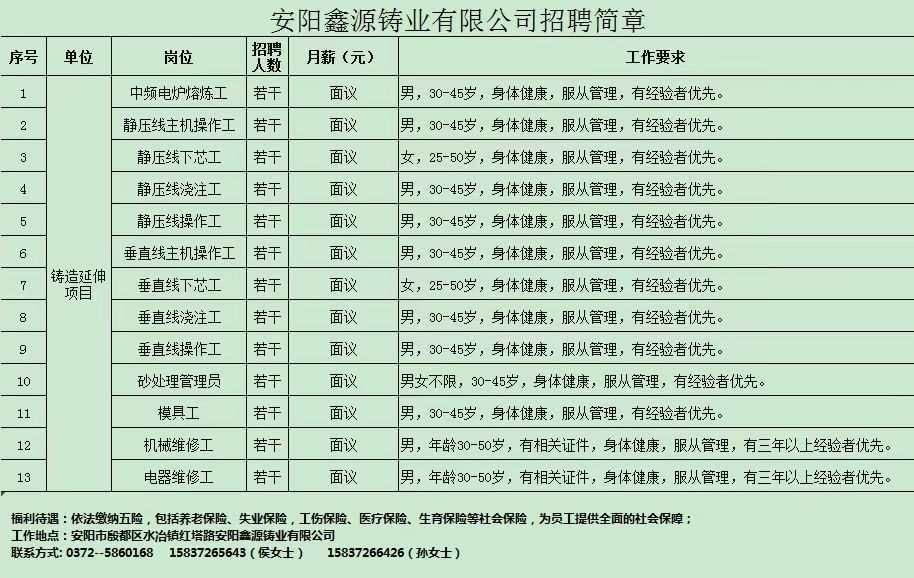 安陽鑫源鑄業有限公司招聘
