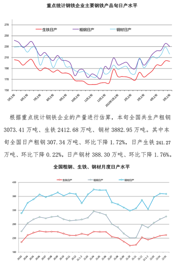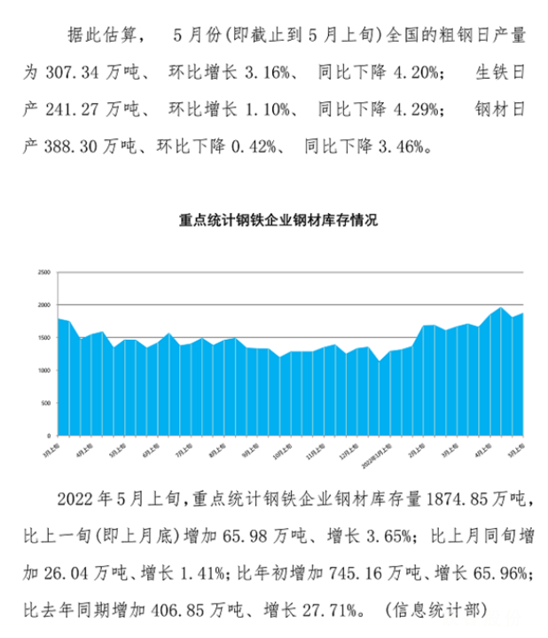 5月上旬重點(diǎn)鋼企粗鋼日產(chǎn)230.53萬噸,環(huán)比下降2.26%;鋼材庫存量1874.85萬噸,比上一旬增長3.65%,比上月同旬增長1.41%。