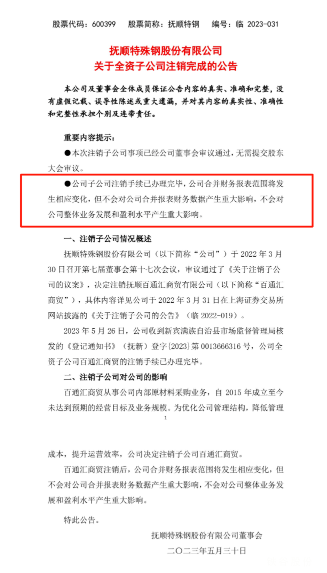 撫順特殊鋼股份有限公司發布關于全資子公司注銷完成的公告:2023年5月26日,公司收到新賓滿族自治縣市場監督管理局核發的《登記通知書》(撫新)登字{2023}第0013666316號,公司全資子公司百通匯商貿的注銷手續已辦理完畢。