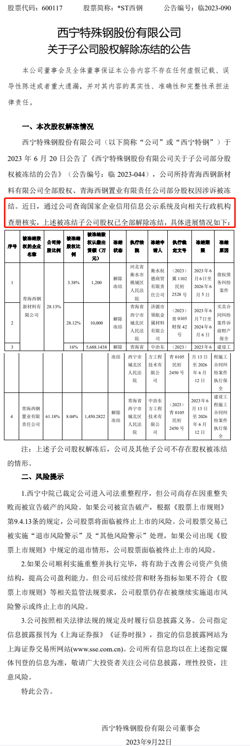 9月22日,西寧特殊鋼股份有限公司發(fā)布關(guān)于子公司股權(quán)解除凍結(jié)的公告。公告內(nèi)容顯示,公司所持青海西鋼新材料有限公司全部股權(quán)、青海西鋼置業(yè)有限責(zé)任公司部分股權(quán)已全部解除凍結(jié)。