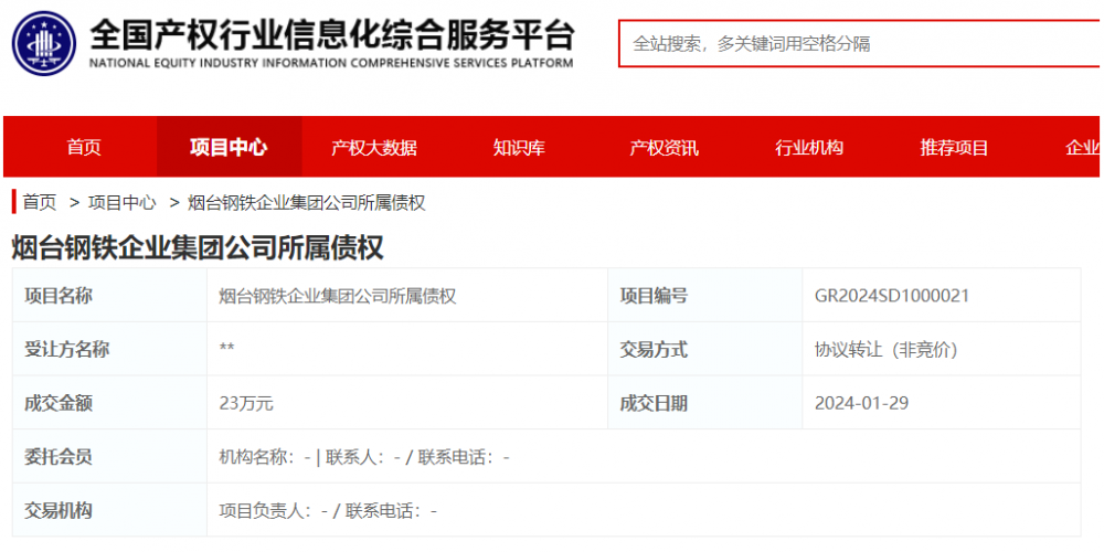 據全國產權交易平臺顯示,從2022年開始,山鋼旗下鋼廠煙臺鋼鐵企業集團公司就開始對外轉讓資產。據最新消息顯示,2024年1月29日煙臺鋼鐵企業集團公司所屬債權項目成交,成交金額23萬。