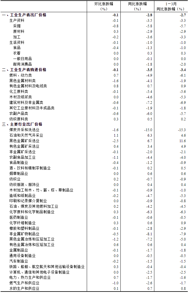 2024年3月份,全國工業生產者出廠價格同比下降2.8%,環比下降0.1%;工業生產者購進價格同比下降3.5%,環比下降0.1%。一季度,工業生產者出廠價格比上年同期下降2.7%,工業生產者購進價格下降3.4%。