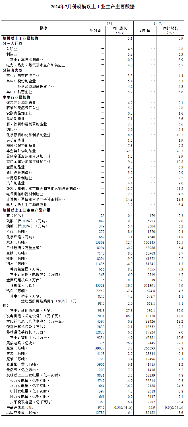 7月份,規(guī)模以上工業(yè)增加值同比實(shí)際增長(zhǎng)5.1%(增加值增速均為扣除價(jià)格因素的實(shí)際增長(zhǎng)率)。從環(huán)比看,7月份,規(guī)模以上工業(yè)增加值比上月增長(zhǎng)0.35%。1-7月份,規(guī)模以上工業(yè)增加值同比增長(zhǎng)5.9%。