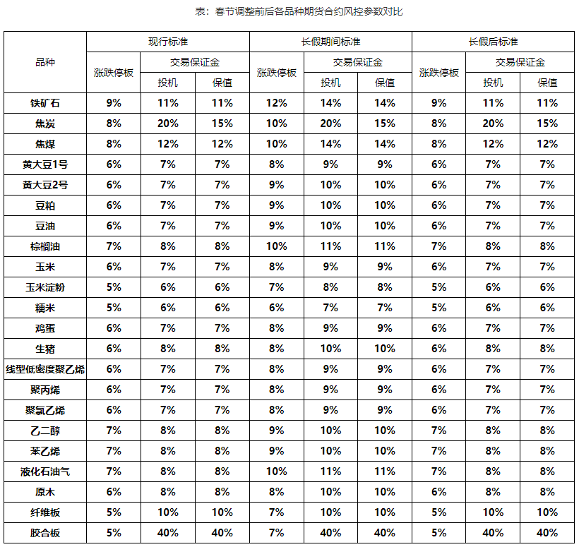 鐵礦石、焦炭、焦煤、黃大豆1號、黃大豆2號、豆粕、豆油、棕櫚油、玉米、玉米淀粉、粳米、雞蛋、生豬、線型低密度聚乙烯、聚丙烯、聚氯乙烯、乙二醇、苯乙烯、液化石油氣、原木、纖維板和膠合板品種期貨合約漲跌停板幅度和交易保證金水平恢復至節前標準。