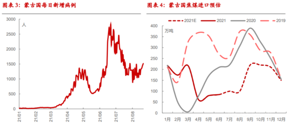 進口方面,今年以來澳煤無進口,全年進口減量3500萬噸。蒙煤方面,二季度開始隨著蒙古國每日新增新冠病例的增加,通關一直維持在200車以內。后期來看,由于季節性影響,給到蒙煤通關的黃金期大概只有9、10兩個月份了,就算9月份之后蒙古國疫情能夠控制到年初情況,假設通關車輛達到500至600車,全年蒙煤預計進口1800萬噸左右,全年同比減少500萬噸。從其他國家的進口來看,上半年其他國家進口煉焦煤增量700萬噸左右,能夠填補部分澳煤缺失。但是從煤種來看,俄羅斯等地的煤種基本為1/3焦為主,因此補充有限。