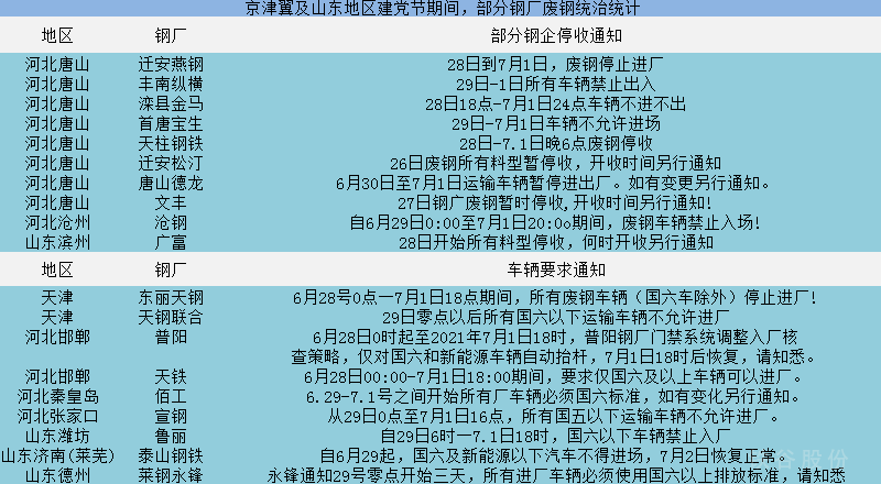 【山東市場】山東受本輪黨慶活動影響總結鋼廠生產方面:據了解目前省內高爐廠石橫永鋒本周尚無檢修計劃,萊鋼總廠正常工作輪流檢修中,閩源鋼廠29-1日三天停一座高爐,產量減半預計影響產能0.6萬噸/天,。物流運輸方面:據鋼廠反饋因為地理位置不同目前僅閩源、永鋒、廣富收到了限行通知,通知內容:2021.6.28日零點至2021.7.1日18時,期間只允許國六和新能源車間進廠,其他車輛不允許出入廠,屆時鋼廠出貨會陷入較低水平。下游工地開工:省內基建以及工地未收到明確停工通知,除非政府活動場所周邊個別限制,下游工地施工無較大影響。綜合來看本次活動對河北鋼廠以及物流運輸影響較大,山東地區除了鋼廠出貨其他方面影響甚微。