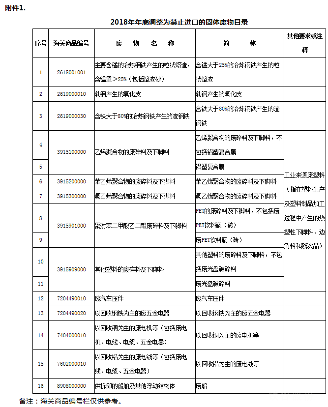 附件:1.2018年年底調(diào)整為禁止進(jìn)口的固體廢物目錄
