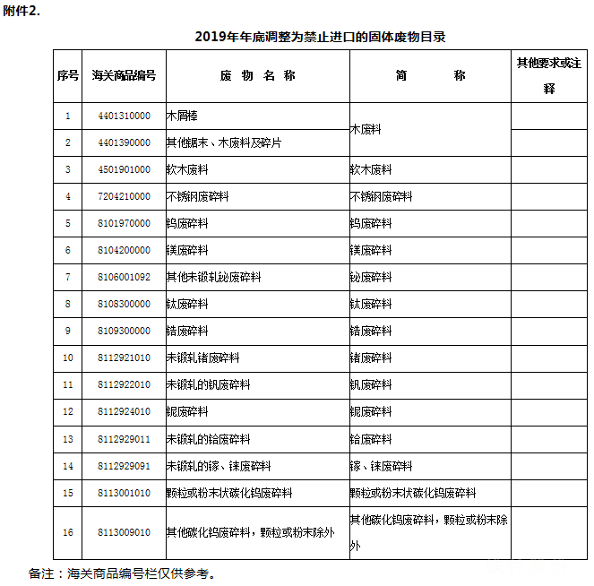 二、將不銹鋼廢碎料、鈦廢碎料、木廢碎料等16個(gè)品種固體廢物(見(jiàn)附件2),從《限制進(jìn)口類可用作原料的固體廢物目錄》《非限制進(jìn)口類可用作原料的固體廢物目錄》調(diào)入《禁止進(jìn)口固體廢物目錄》,自2019年12月31日起執(zhí)行。