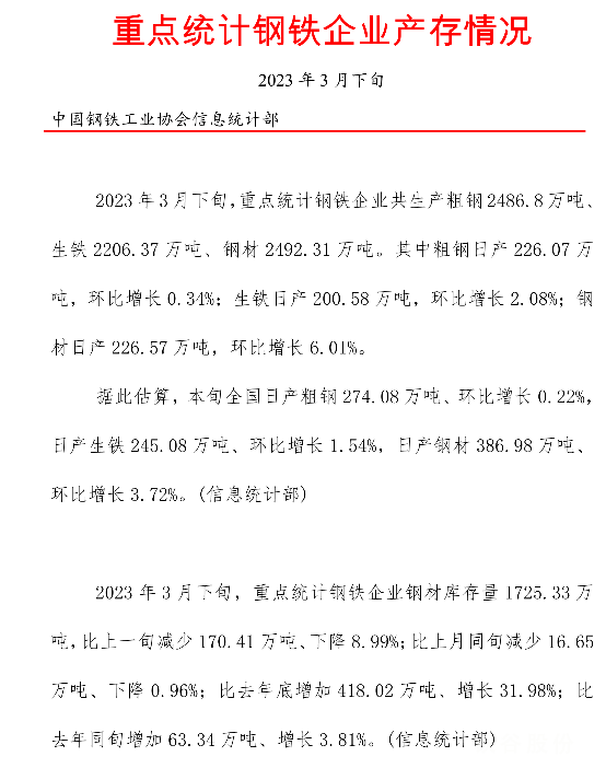 2023年3月下旬重點統計鋼鐵企業產存情況