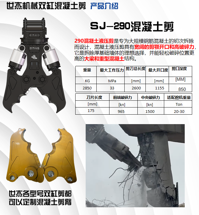 290混凝土液壓剪是專為大規(guī)模鋼筋混凝土的初次拆除而設(shè)計,混凝土液壓剪具有寬闊的剪顎開口和高破碎力,它是拆除厚基礎(chǔ)墻體的理想選擇,并能輕松破碎位置更高的大梁和重型混凝土結(jié)構(gòu)。